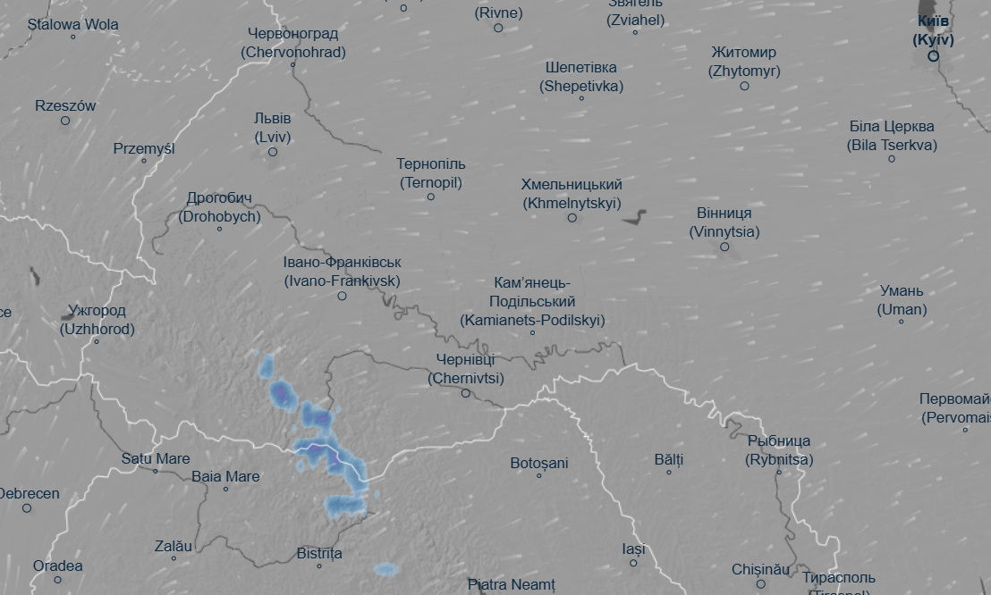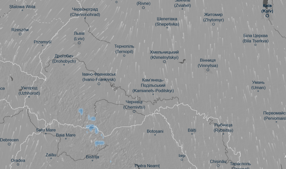 Интерактивный синоптический сервис Ventusky показывает, что 29 и 30 октября снег будет идти на Закарпатье и Буковине.