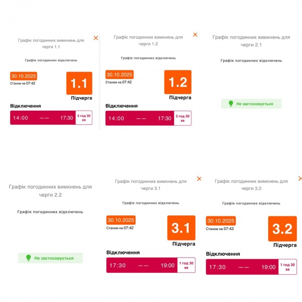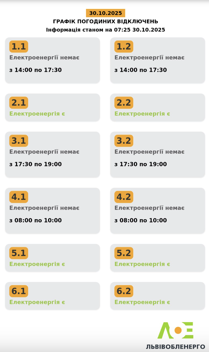 В Черновцах с 09:30 до 14:00 графики почасовых отключений (ГПО) отменены. После 14:00 возможны отключения по очереди, режим работы графиков может изменяться в зависимости от ситуации в энергосистеме Украины.