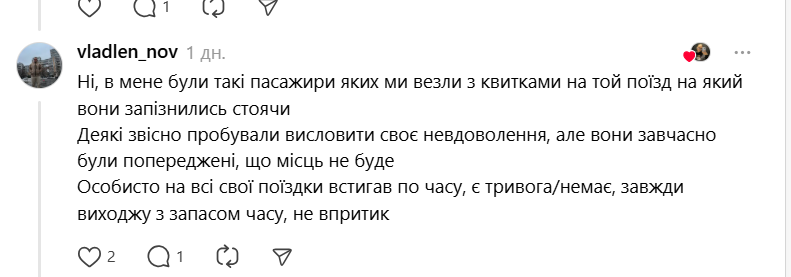 Некоторые комментаторы подчеркнули, что видели, как это работает в действии. В случае, если свободных мест на поезд нет, пассажиры могут ехать стоя. Напомним, если на поезд опоздали по вине Укрзализныци, например, при задержке на стыковочный рейс – УЗ также довезет до места назначения.