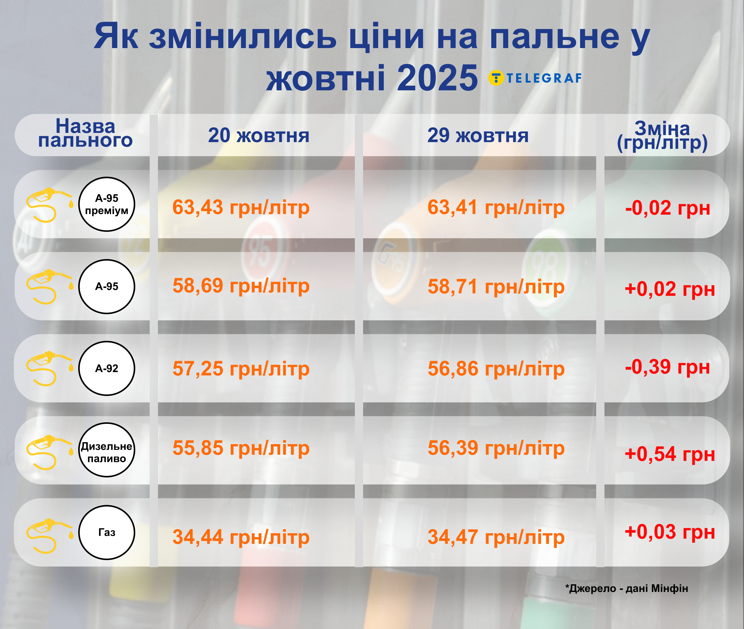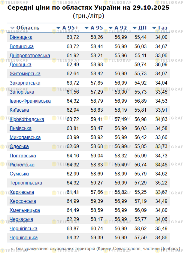 Цена на горючее также варьируется от области к области. Самая низкая цена на бензин А-92 по состоянию на 29 октября 2025 года – в Запорожской области, где он стоит 53 грн/л. Самая высокая цена на А-92 по состоянию на 29 октября 2025 года – в Сумской области, где он стоит 58, 99 грн/л.
