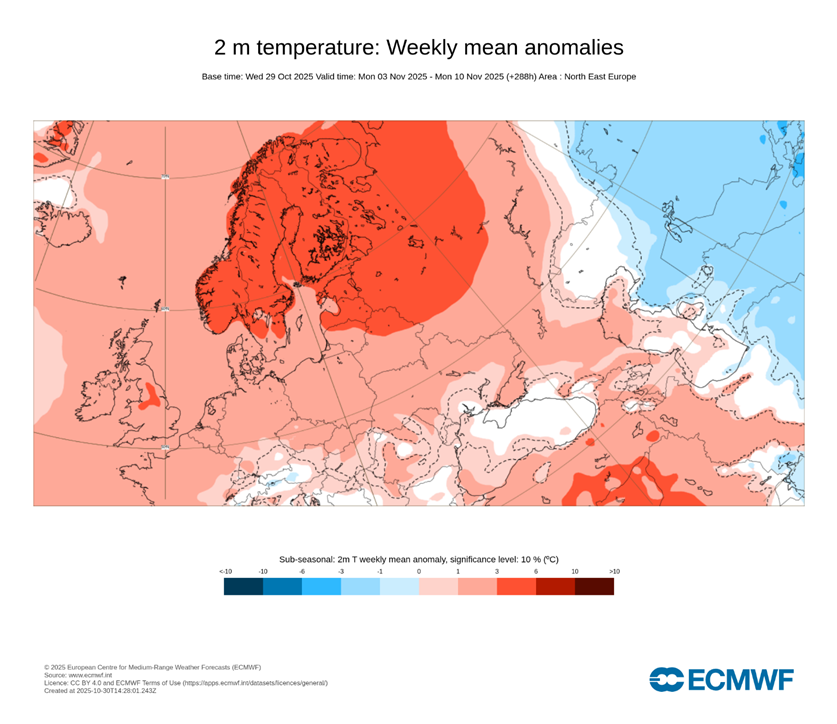С 6 по 8 ноября температурный фон существенно не изменится и только с 9 ноября начнётся постепенное похолодание с севера, в результате которого средние показатели температуры снизятся на 4 – 8 °С. Таким образом, первая декада месяца предвидится аномально тёплой, что хорошо заметно по прогностической карте на период с 3 по 10 ноября.
