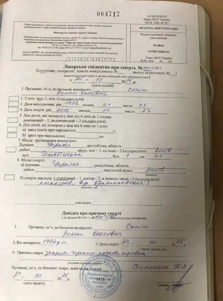 - Сопин скончался 23 октября. 19 октября его госпитализировали из распределительного пункта территориального центра комплектования в Киеве