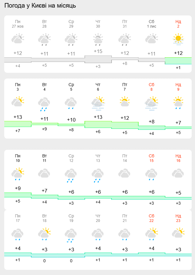 Напомним, известный синоптик Игорь Кибальчич рассказывал "Телеграфу", что ноябрь в Украине обещает быть спокойным и прохладным, но без настоящей зимы. Первые намеки на снег появятся только во второй половине месяца, когда температура начнет опускаться до нуля.