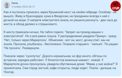 Запрет уже начал работать. Водитель гибрида из Краснодара пыталась через Крымский мост въехать в Крым. Однако ее не пропустили. Не помогли уговоры, упоминания спящего в машине ребенка. Пришлось ехать через оккупированный Мариуполь. По словам россиянки, "дорога нормальная, но фур много, обгоны по встречке".
