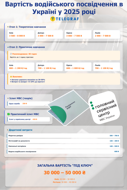 "Телеграф" рассказывает о том, сколько в 2025 году стоит получить водительское удостоверение (категория B — легковушки и легкие грузовики) в Украине.