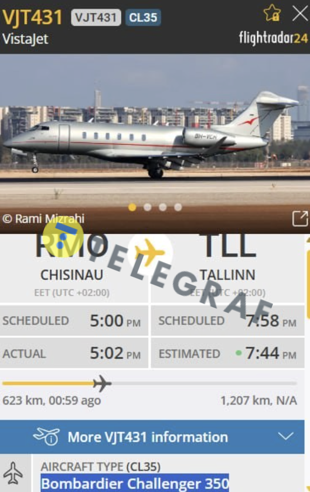 По данным радара, борт рейса VJT431 компании VistaJet вылетел в 17:00 из Кишинева, Молдова, и приземлился в 19:44 в Таллинне, Эстония. Полет длился более двух часов. За это время борт якобы пересек закрытое воздушное пространство в Украине и долетел почти до Львова, что показано на карте ниже.