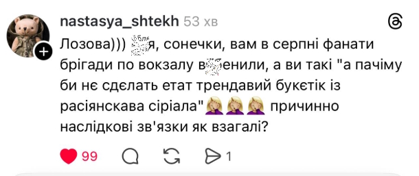 Но в комментариях напомнили, что в августе "фанаты "Бригады" совершили массированную атаку на транспортную инфраструктуру в Лозовой, в результате чего были погибшие и раненные. В магазине же все равно решили сделать "трендовый букет".