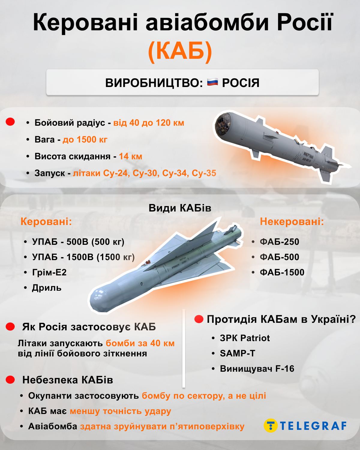 Об этом "Телеграфу" стало известно из ответа на запрос нашей редакции в Главное управление разведки Министерства обороны Украины. В ведомство мы обращались, чтобы узнать, есть ли угроза КАБов для Киева, на какое расстояние летят КАБы, и о том, универсальные модули планирования и коррекции (УМПК) имеют компоненты стран Запада или только китайские.