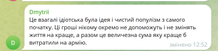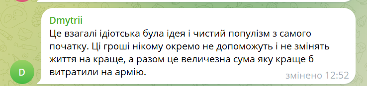 - Это вообще идиотская была идея и чистый популизм с самого начала. Эти деньги никому отдельно не помогут и не изменят жизнь к лучшему, а вместе это огромная сумма, которую лучше бы потратили на армию.