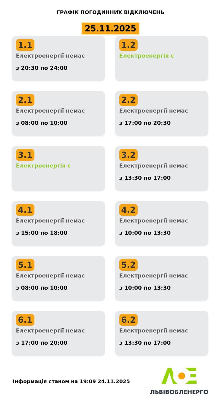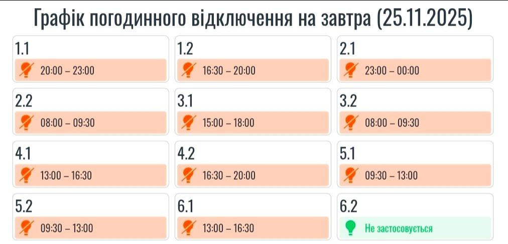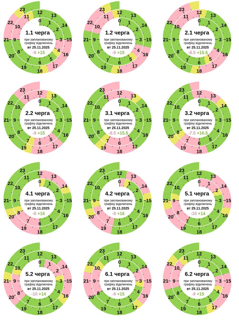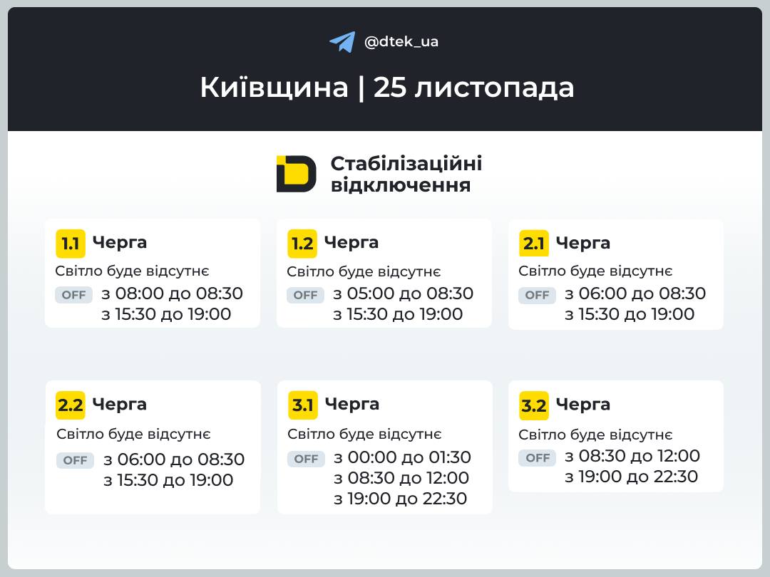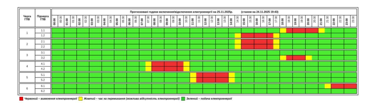 Из-за энергетического террора России украинцы вынуждены жить в условиях постоянных отключений света. Поэтому во вторник, 25 ноября, в течение всего дня в стране будут задействованы сразу от 0,5 до 2,5 очередей отключения, сообщает "Укрэнерго".