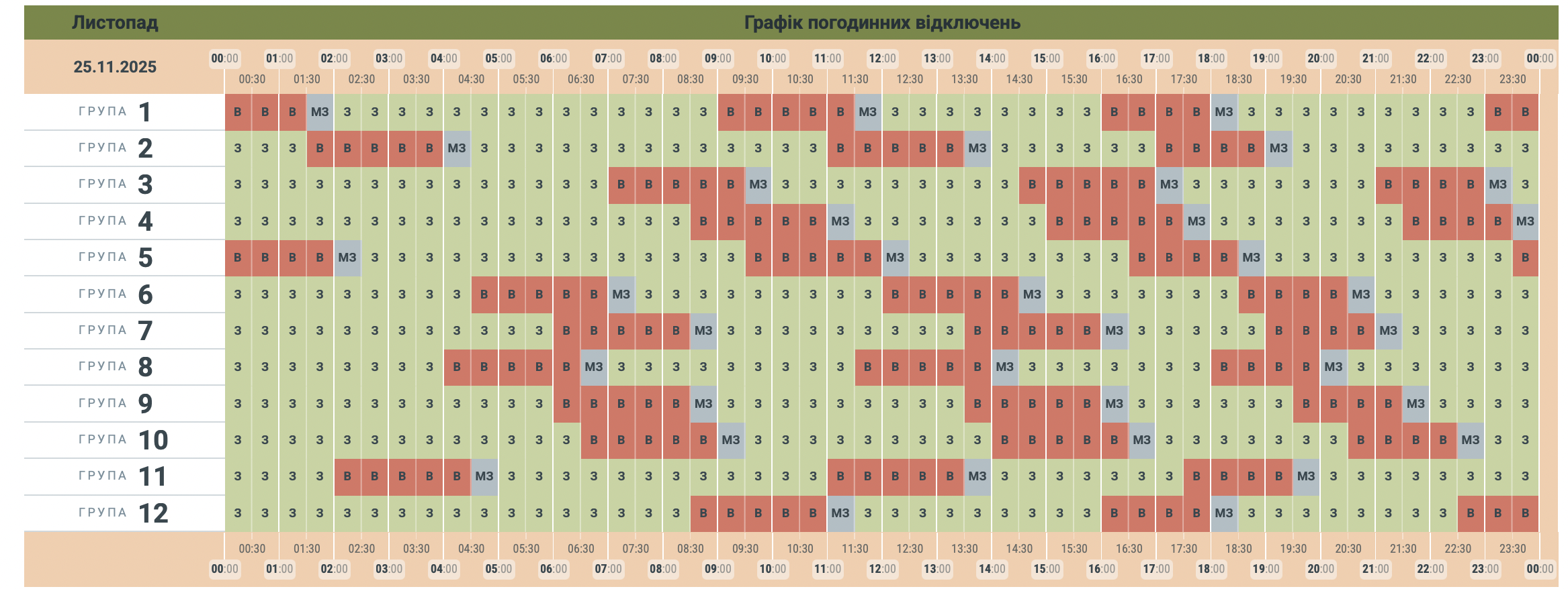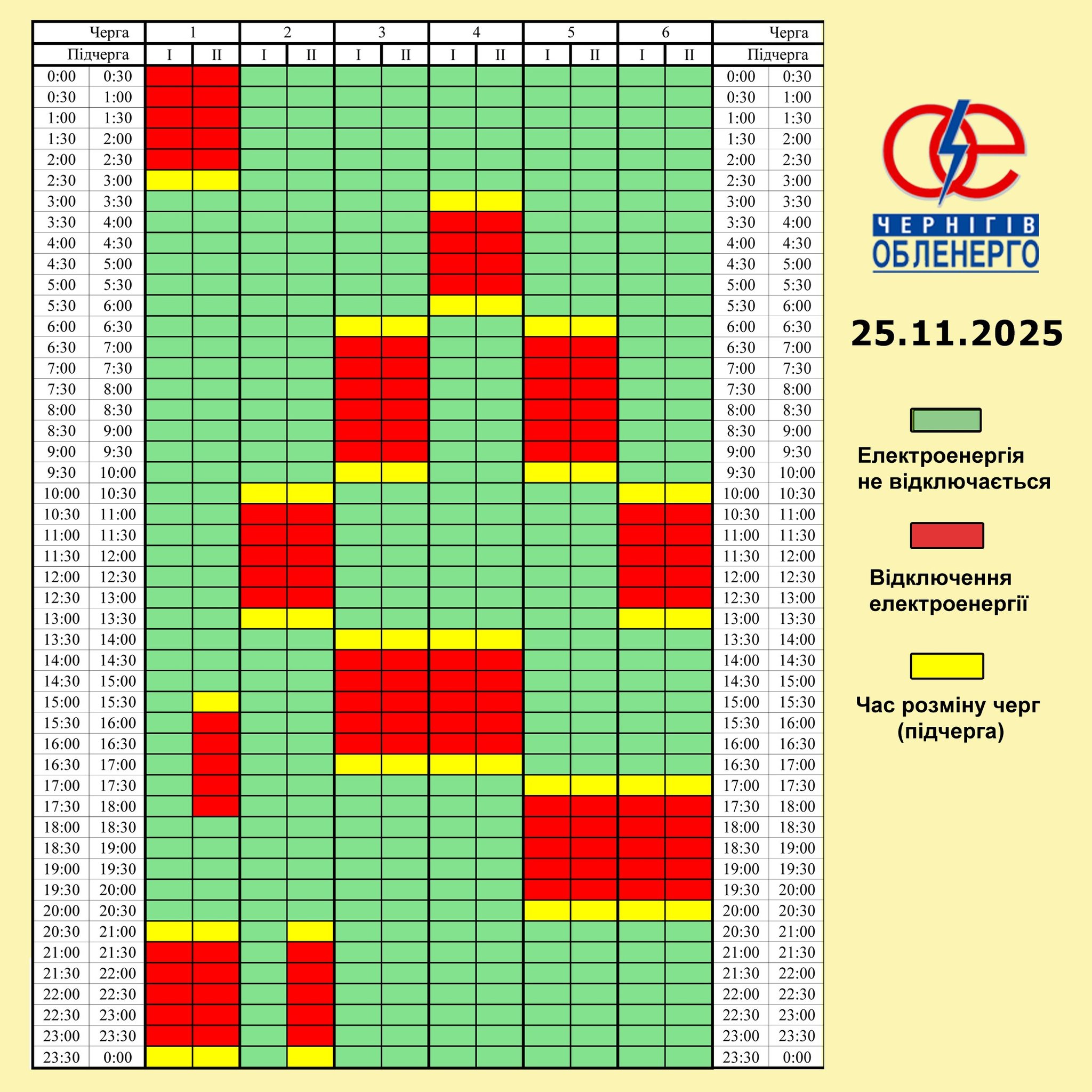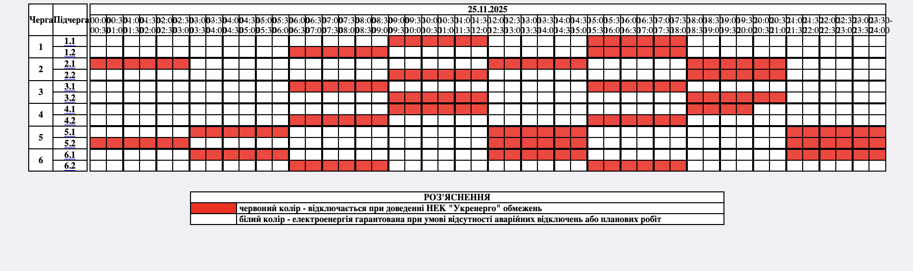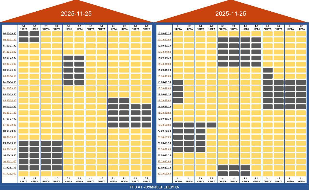 Из-за энергетического террора России украинцы вынуждены жить в условиях постоянных отключений света. Поэтому во вторник, 25 ноября, в течение всего дня в стране будут задействованы сразу от 0,5 до 2,5 очередей отключения, сообщает "Укрэнерго".