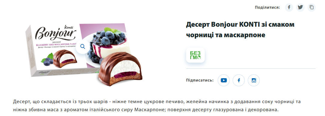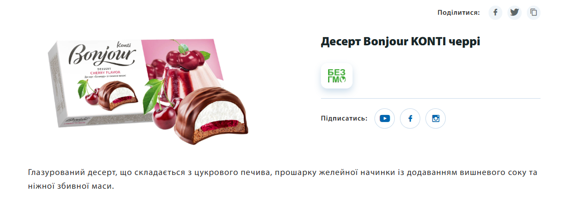 Десерты "Бонжур", производимые одной из крупнейших кондитерских фабрик "Конти" (Konti), названы в честь французского приветствия "Bonjour" ("добрый день"). Это создает ассоциацию с изысканными сладостями.