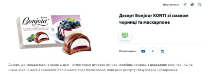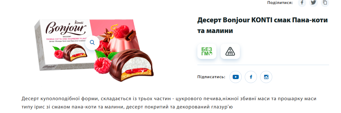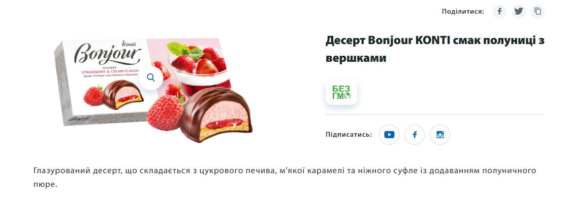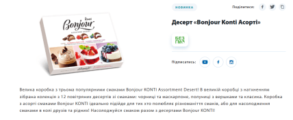 На момент запуска десерта в 2005 году аналогов этой линии в Украине не было. В десерте Bonjour гармонично сочетали сахарное печенье, желейную начинку, воздушное суфле, покрытое шоколадной глазурью.