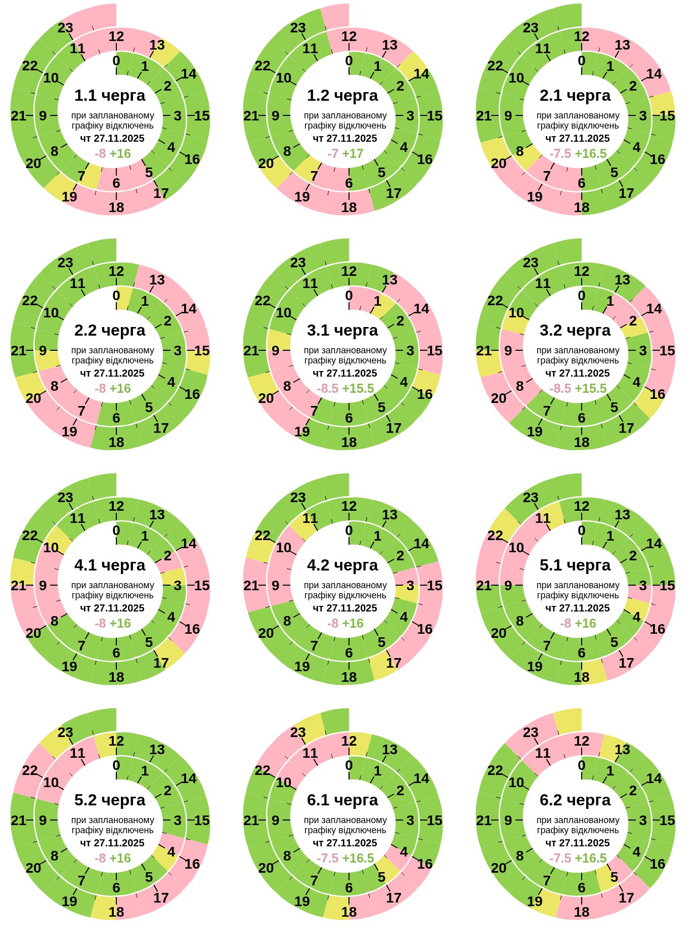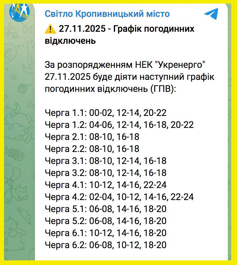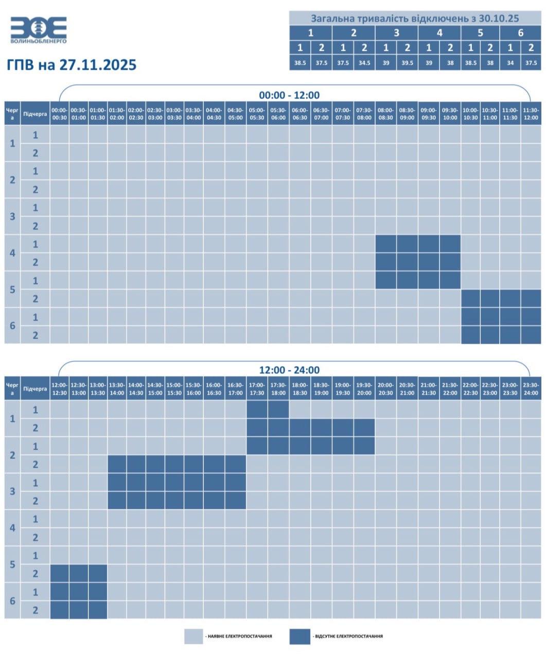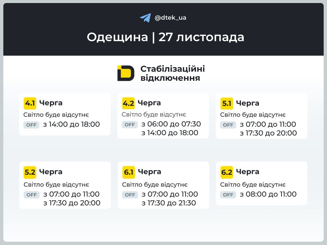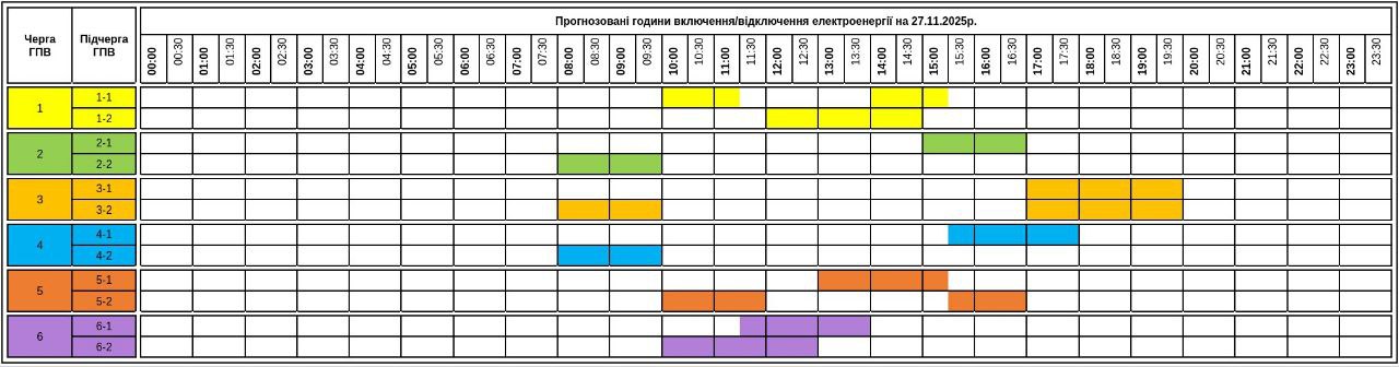 Из-за энергетического террора России украинцы вынуждены жить в условиях постоянных отключений света. Поэтому в четверг, 27 ноября, в течение всего дня в стране будут задействованы сразу от 0,5 до 2,5 очередей отключения, сообщает "Укрэнерго"