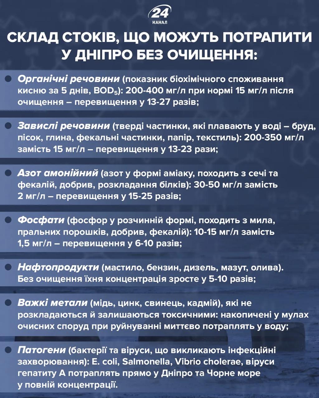 После уничтожения очистных сооружений Камышаны (мощностью 250 тысяч м³/сутки) неочищенные стоки попадут прямо в реку Днепр. Прекращение биологической очистки означает сброс органики, патогенов и тяжелых металлов прямо в эстуарий Днепр-Буг (уникальная экосистема, где пресная вода Днепра смешивается с морской водой Черного моря).