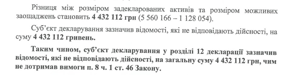 "Разница между размером задекларированных активов и размером возможных сбережений составляет 4 432 112 грн… Таким образом, субъект декларирования в разделе 12 декларации указал сведения, не соответствующие действительности, на общую сумму 4 432 112 грн, чем не выполнил требования п. 8 ч. 4 ст 46 Закона ("О предотвращении коррупции". – Ред.)", – говорится в соответствующем пункте заключения НАПК о Хандусенко.