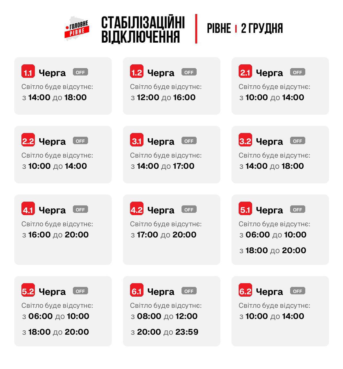 Графики отключений в Ровенской области 2 декабря
