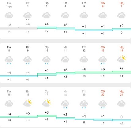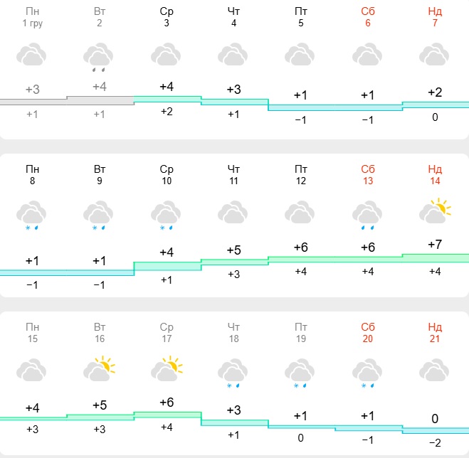 В то же время прогноз meteo.ua также обещает дожди и снег уже в ближайшее время (9 числа дождь и 11 снег). Столбики термометров в это время опустятся до +1+3 градусов. А вот небольшое временное потепление, по мнению синоптиков этого сайта, немного отложится, примерно до 18 числа.