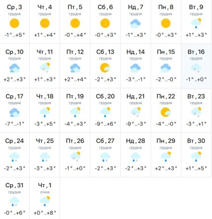 Так, согласно данным метеорологического сайта meteofor, уже с 8 декабря в Харькове пройдут дожди с мокрым снегом. Такая погода может затянуться на несколько дней, а столбики термометров в это время могут опустится до -1+1 градуса. Впрочем, с 11 декабря, по мнению синоптиков, температуры еще смогут порадовать жителей областного центра показателями на уровне +4+7 градусов.