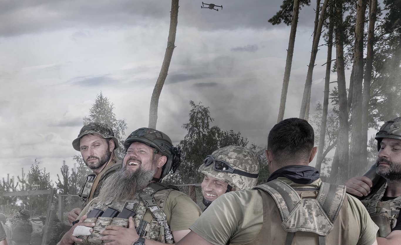 Но самым тщательным воспроизведением сайт называет фото Эмерика Люссе (Emeric Lhuisset) под названием "Издалека я слышу ответ казаков". Он создал ее вблизи Киева летом 2023 года с бойцами 112-й отдельной бригады ТРО. Люльку заменил современный вейп, а мечи – РПГ. Над бойцами летает дрон, а среди защитников есть женщины.