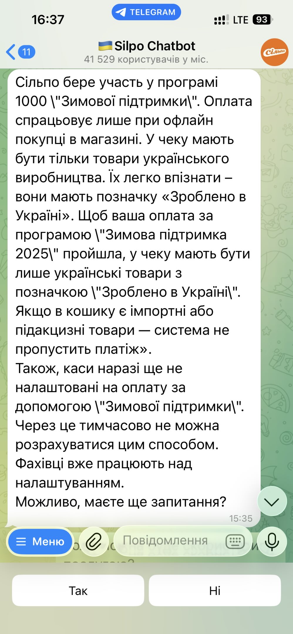 Сейчас кассы в супермаркетах "Сильпо" еще не настроены на оплату с помощью "Зимней поддержки". Поэтому пока рассчитаться этим способом не получится. Специалисты уже работают над настройкой.