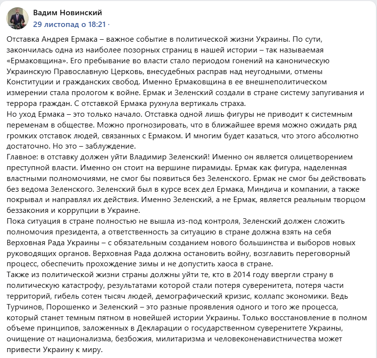 "Именно Ермаковщина в ее внешнеполитическом измерении стала прологом к войне. Ермак и Зеленский создали в стране систему запугивания и террора граждан. С отставкой Ермака рухнула вертикаль страха", — написал Новинский.