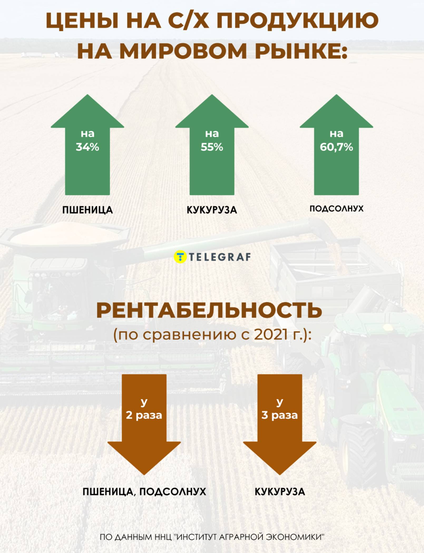 На фоне роста цен на сельскохозяйственную продукцию на мировом рынке – с 34,9% на пшеницу до 60,7% на подсолнечник – рентабельность этих культур заметно уменьшается. В частности, вдвое по сравнению с довоенным 2021 по пшенице и подсолнечнику, и втрое — по кукурузе. Высокие прибыли получают только крупные аграрные холдинги, констатируют в ННЦ "Институт аграрной экономики". Ведь они имеют меньшую себестоимость производства благодаря собственной логистике и переработке.