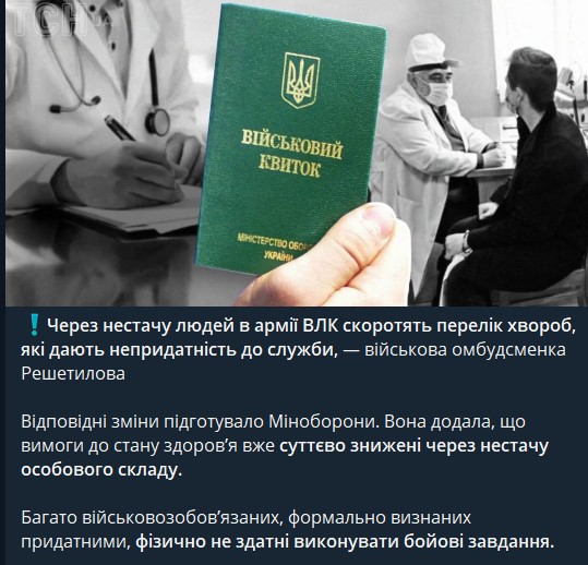 Из-за нехватки личного состава в армии военно-врачебные комиссии якобы сократят список болезней, по которым людей признают непригодными к службе. Такое заявление приписали военному омбудсмену Ольге Решетиловой телеграмм-каналы.
