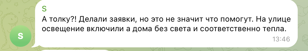 • А толку? Делали заявки, но это не значит, что помогут. На улице освещение включили дома без света и соответственно тепла.