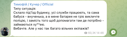 Похожее мнение выразил и волонтер Тимофей Кучер: "Типа ситуация: Сложило подъезд дома, все службы работают, та самая бабушка — внученька, а у меня батарея не греет, вызовите полицию, и вместо того, чтобы помогать там, где нужно — занимаются ху**ей. Извините. Но у нас так много свободных экипажей?"
