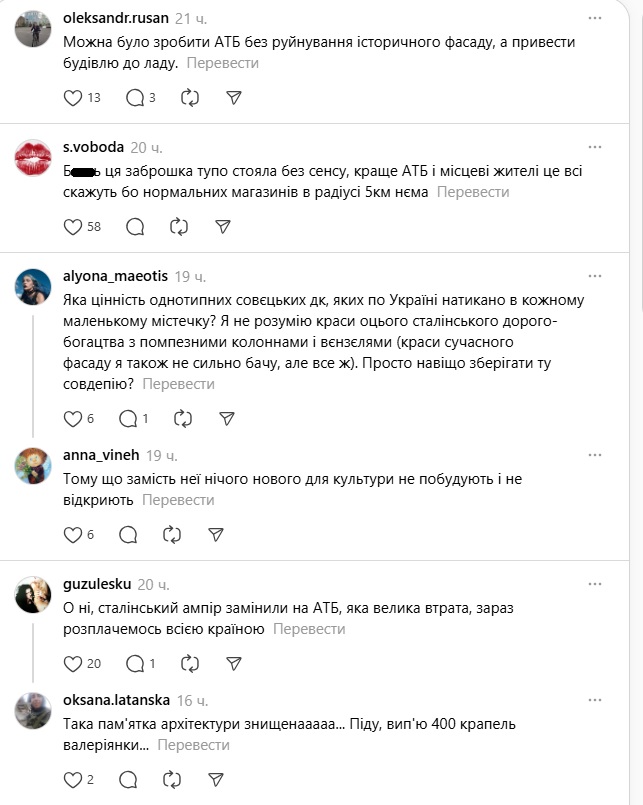 "Раньше это было здание дома культуры, но АТБ и городской совет, видимо, решили, что лучше вместо лица культуры будет супермаркет и разрушили весь бывший фасад здания. Колонны, пилястры, внутренний ремонт – все разрушено. Позади оставили неомодерный балкон бывшего дворца культуры. Это все, что от него осталось. Позорище", — добавляет автор.