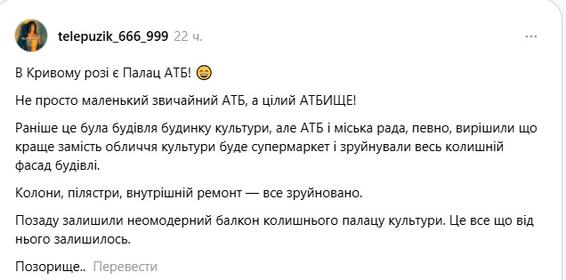 "В Кривом Роге есть Дворец АТБ! Не просто маленький обычный АТБ, а целое АТБИЩЕ!", — описывает здание автор поста.