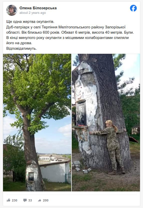 В феврале 2023 года стало известно, что уникальный дуб-патриарх оккупанты срубили на дрова. Дуб, который был высотой 40 м и стволом в 5 м 23 см, почти как четыре человеческих обхвата, с разросшимися корнями на 100 м. Люди со всей Украины и мира приходили к нему. Тогда грустную новость сообщила офицер ВСУ Елена Белозерская.