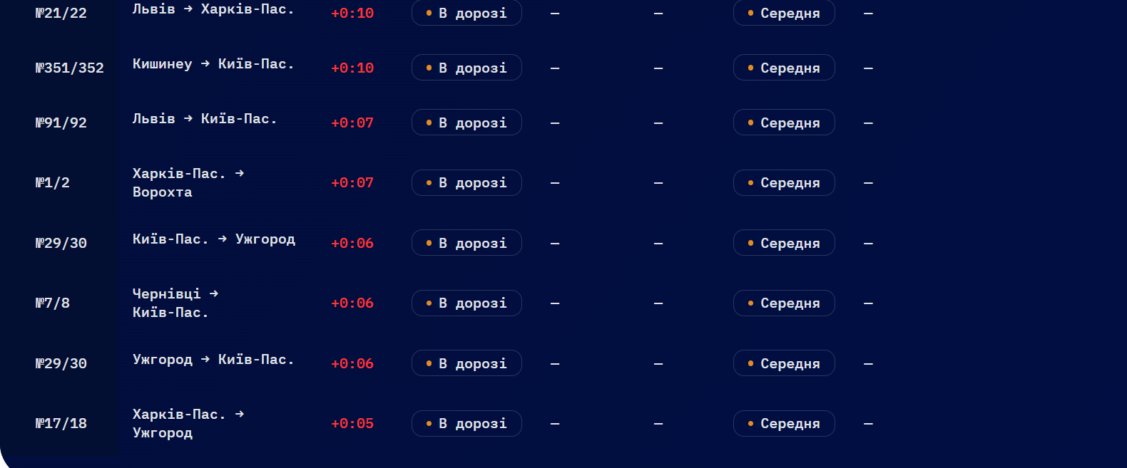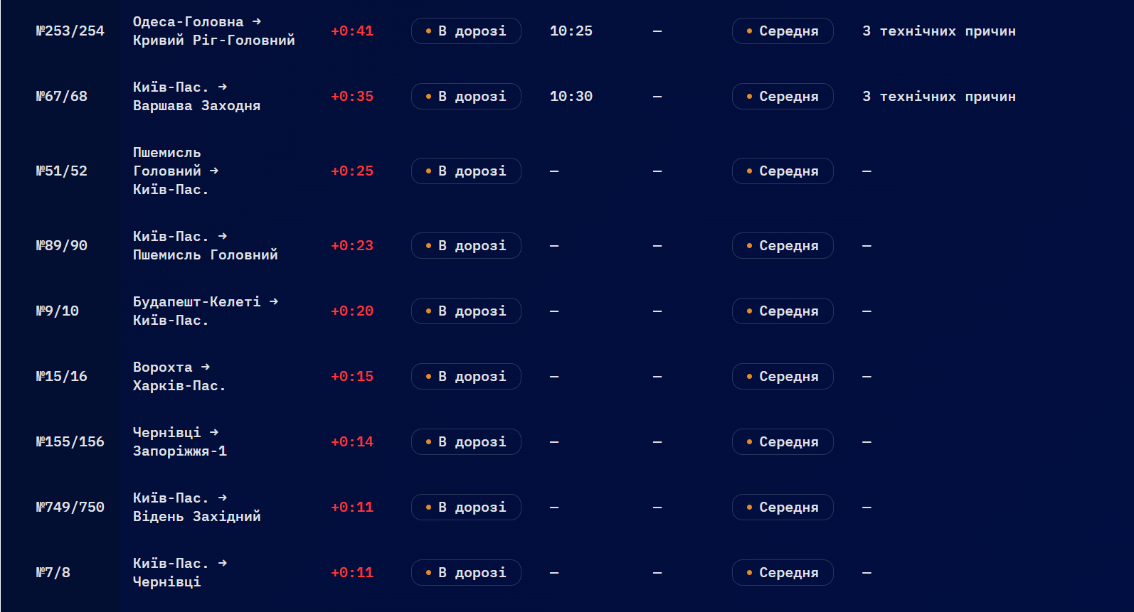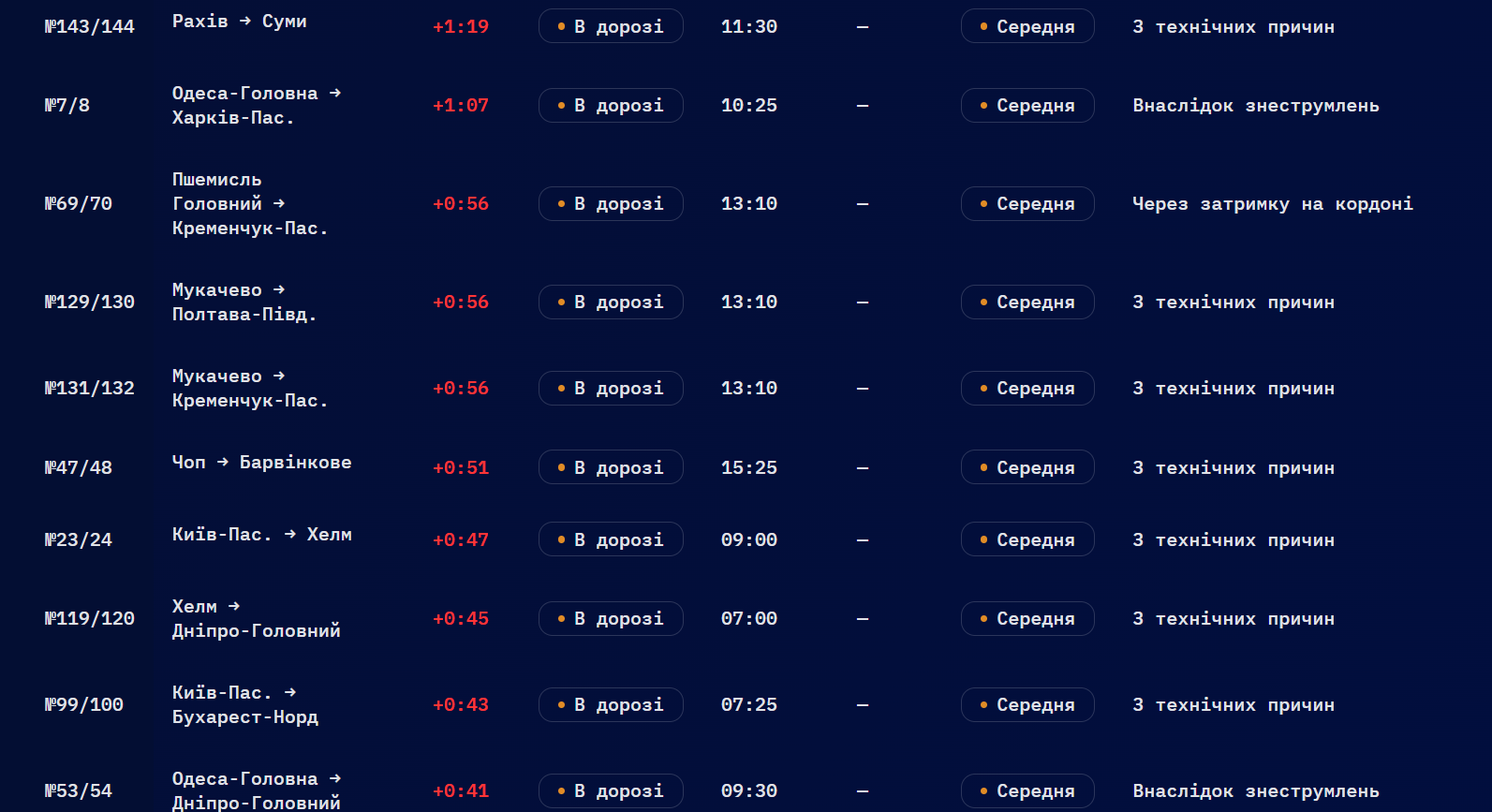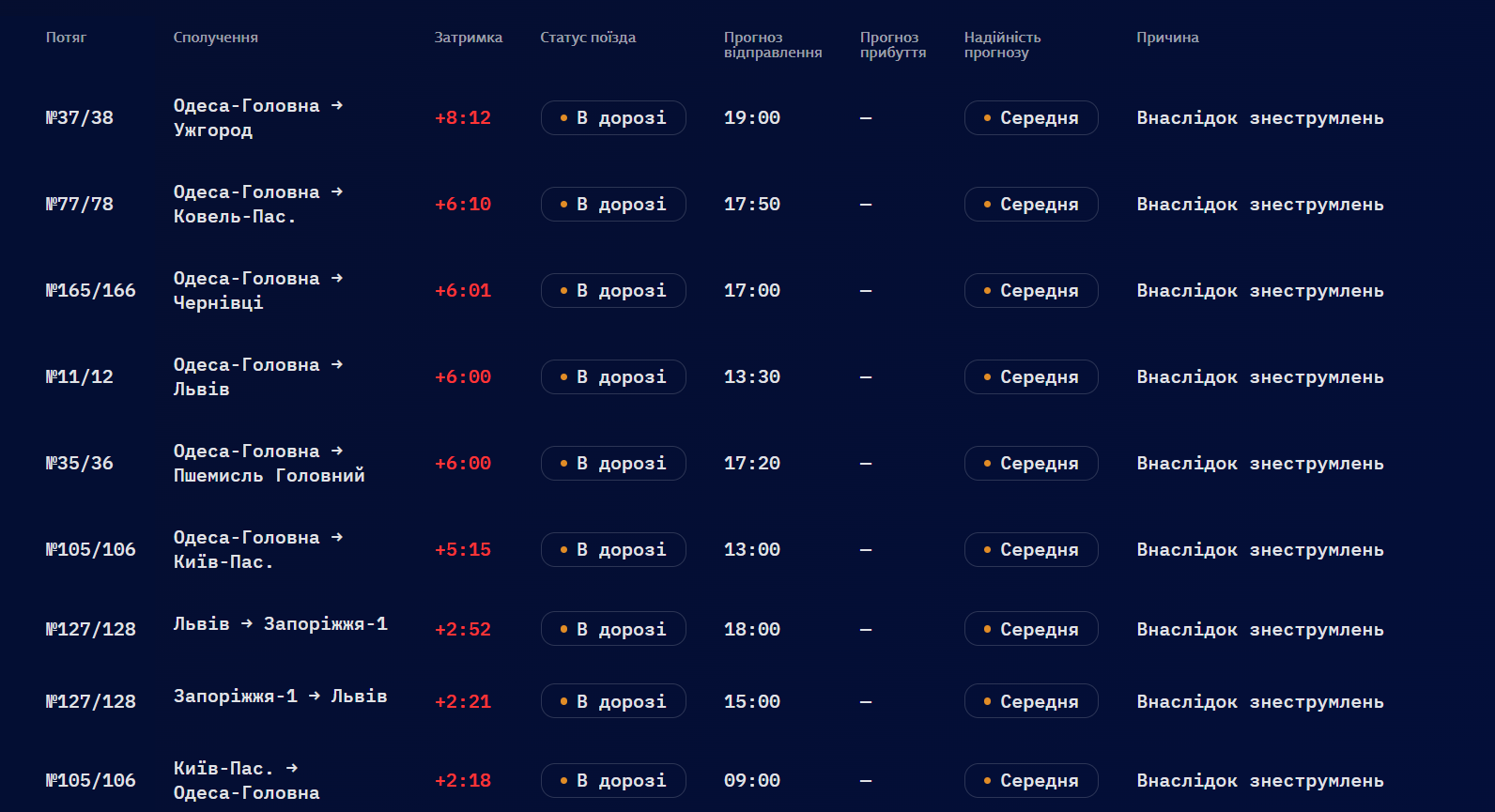 Все поезда "Укрзализныци" продолжают движение, однако часть с отставанием от графика. О времени задержки поездов оперативно информируют на uz-vezemo. Наибольшие отставания у рейсов Одесса — Ужгород +8:12, Одесса — Ковель +6:10, Одесса — Черновцы +6:01. Поезд №6251 Вапнярка – Одесса-Главная следует с задержкой +4 часа.