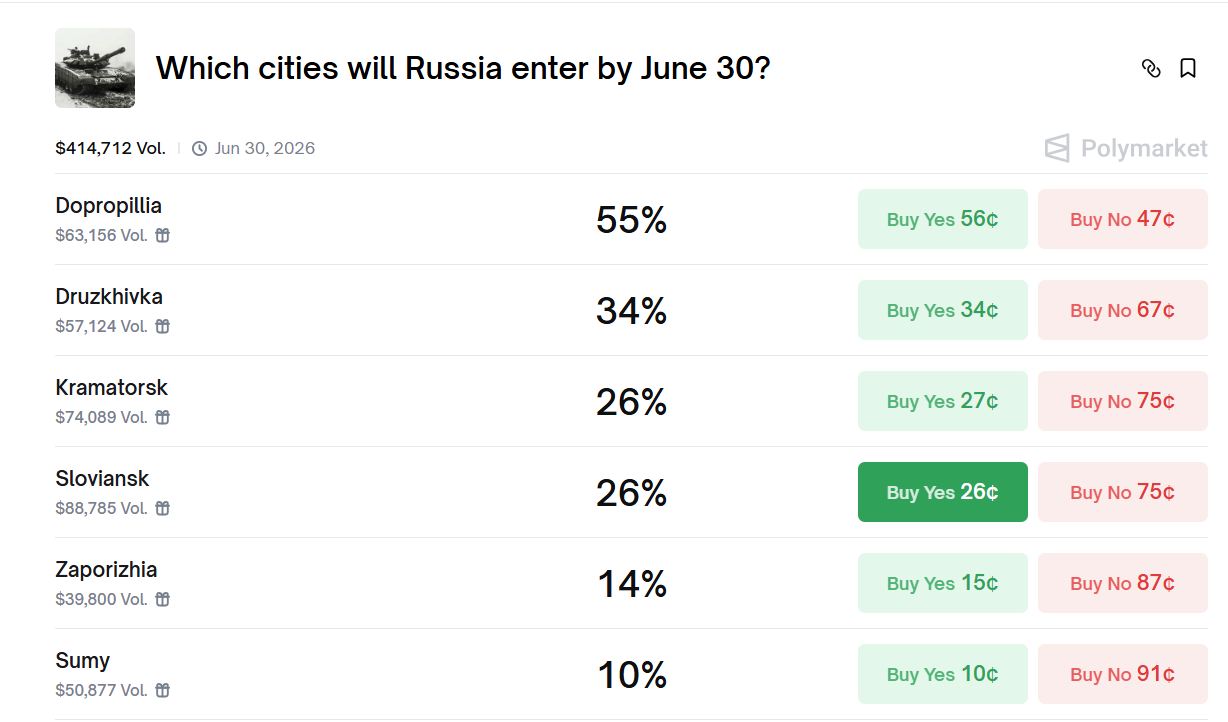 Polymarket — это платформа, где люди делают ставки на определенные события (выборы, экономика, спорт и т.д.). Если они угадывают, зарабатывают деньги, если нет, теряют свою ставку. Если сейчас поставить 100 долларов на то, что РФ захватит Славянск до 30 июня, выигрыш составит чуть более 892 долларов. Если сделать ставку на то, что враг не оккупирует этот город на Донетчине в размере тех же 100 долларов, выигрыш будет 111 долларов.