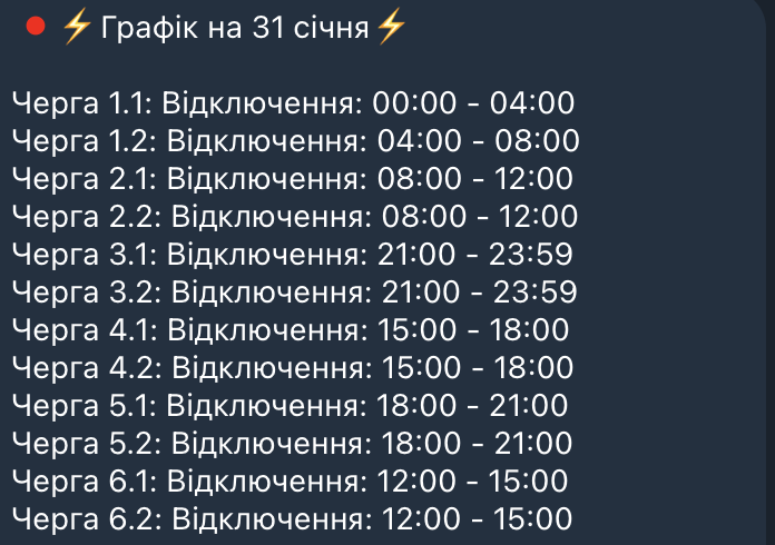 Из-за энергетического террора России украинцы вынуждены жить в условиях постоянных отключений света. В субботу, 31 января, в течение всего дня в стране будут отключения электричества для бытовых потребителей, сообщает "Укрэнерго"
