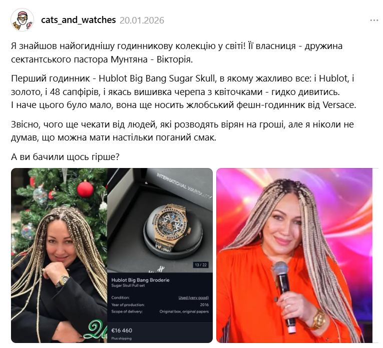 Жена сектантского пастора Мунтяна имеет "отвратительную" коллекцию часов (фото)