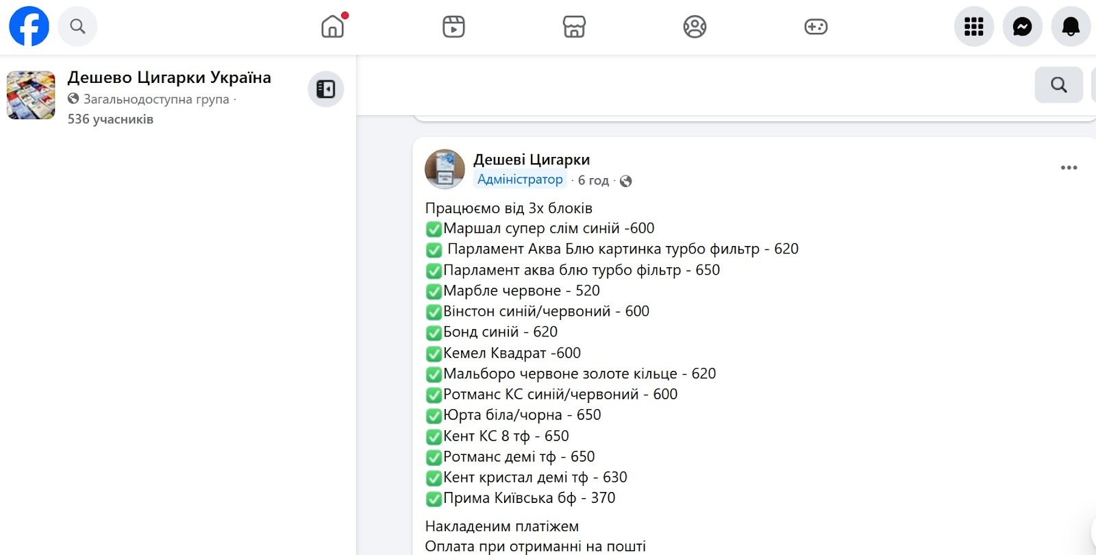 "Дешевые сигареты. Работаем от трех блоков". Такими сообщениями изобилуют открытые страницы в украинской зоне Facebook с сотнями и тысячами активных участников. Блок сигарет известных марок (Parliament, Bond, Kent, Marlboro и других) там можно приобрести за 350—650 гривен со сроком пересылки по почте всего один—три дня.