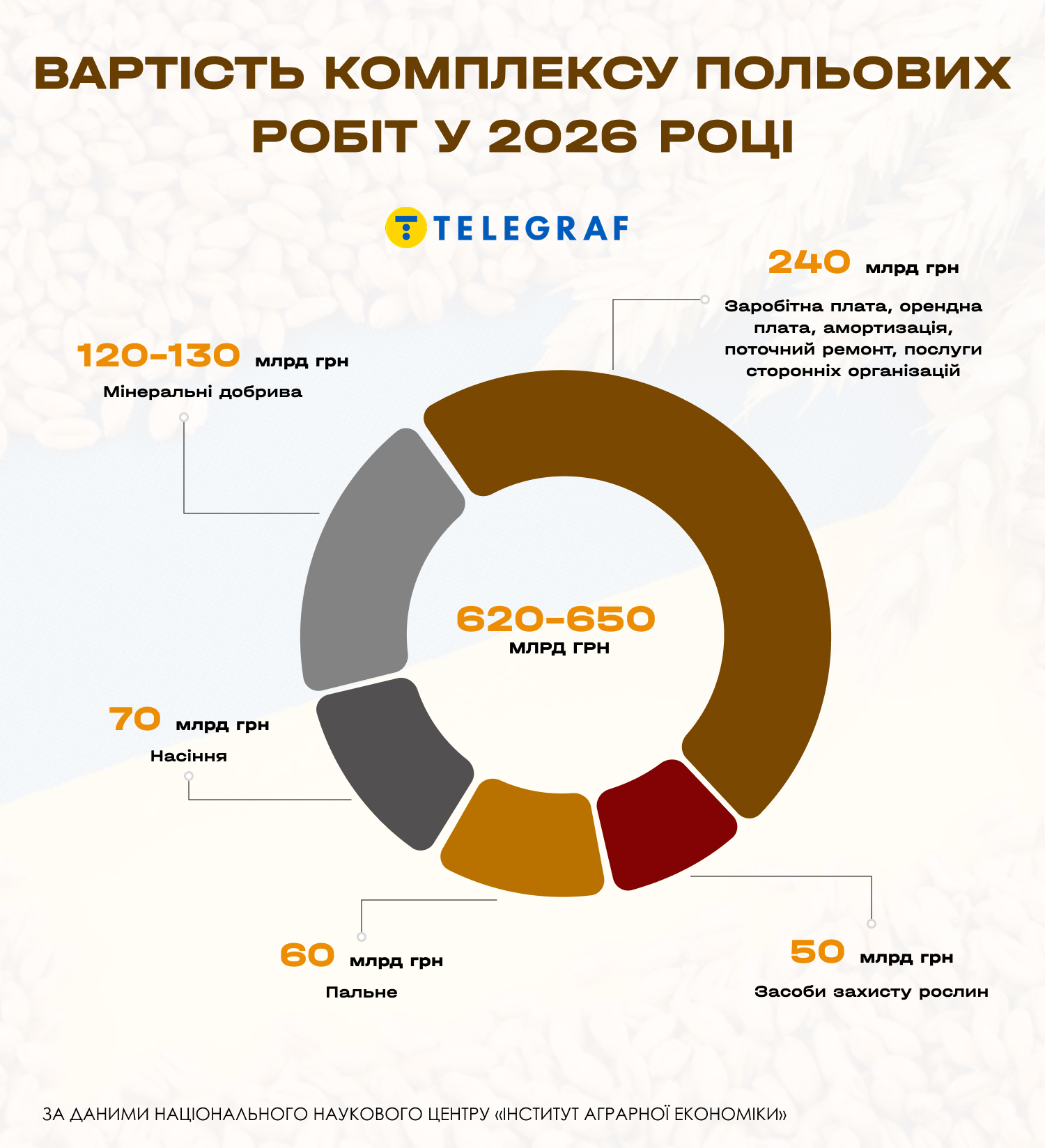 – В 2026 году сельхозпроизводителям придется потратить на комплекс полевых работ на 5-10% больше: вместо прошлогодних почти 600 млрд. гривен – до 620-650 млрд. гривен, – приводит расчеты ученых "Института аграрной экономики" Александр Захарчук.