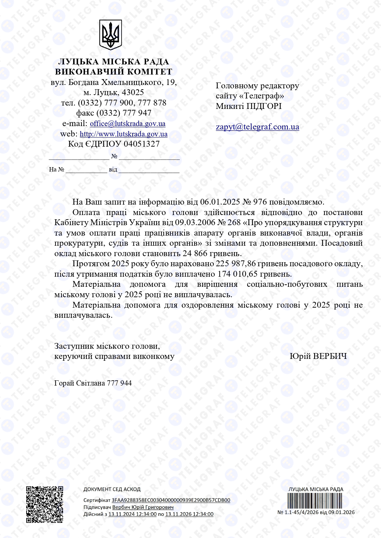 Согласно официальному ответу, должностной оклад городского головы составляет 24 866 гривен в месяц.