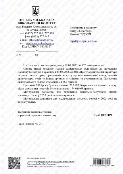 Об этом "Телеграфу" сообщили в Луцком городском совете в ответ на соответствующий запрос. Там рассказали о размере заработной платы городского головы и суммы фактических выплат за текущий год.