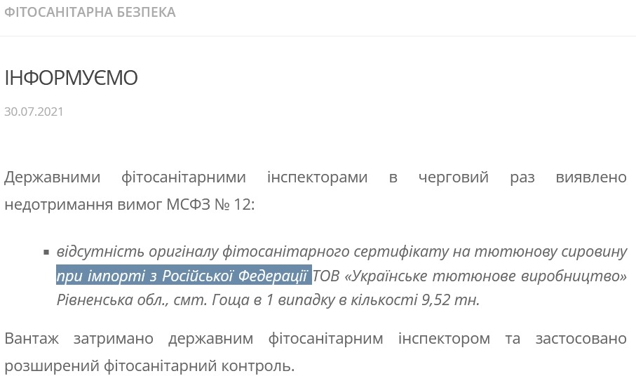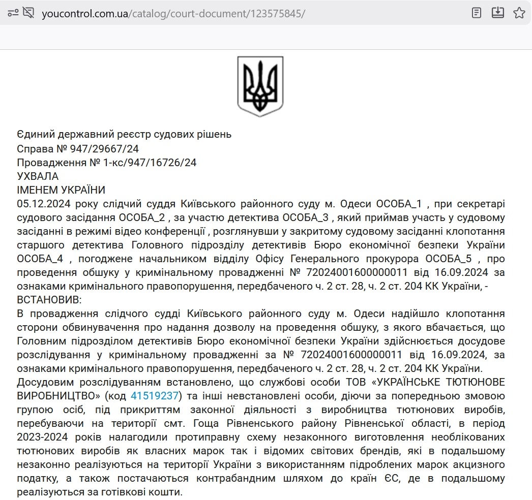 "Досудебным расследованием установлено, что должностные лица ООО "УКРАИНСКОЕ ТАБАЧНОЕ ПРОИЗВОДСТВО" (код 41519237) и другие неустановленные лица, действуя по предварительному сговору группой лиц, под прикрытием законной деятельности по производству табачных изделий, находясь на территории пгт Гоща Ровенского района Ровенской области, в период 2023-2024 годов наладили противоправную схему незаконного изготовления неучтенных брендов, которые в дальнейшем незаконно реализуются на территории Украины с использованием поддельных марок акцизного налога, а также поставляются контрабандным путем в страны ЕС, где в дальнейшем реализуются за наличные средства”.