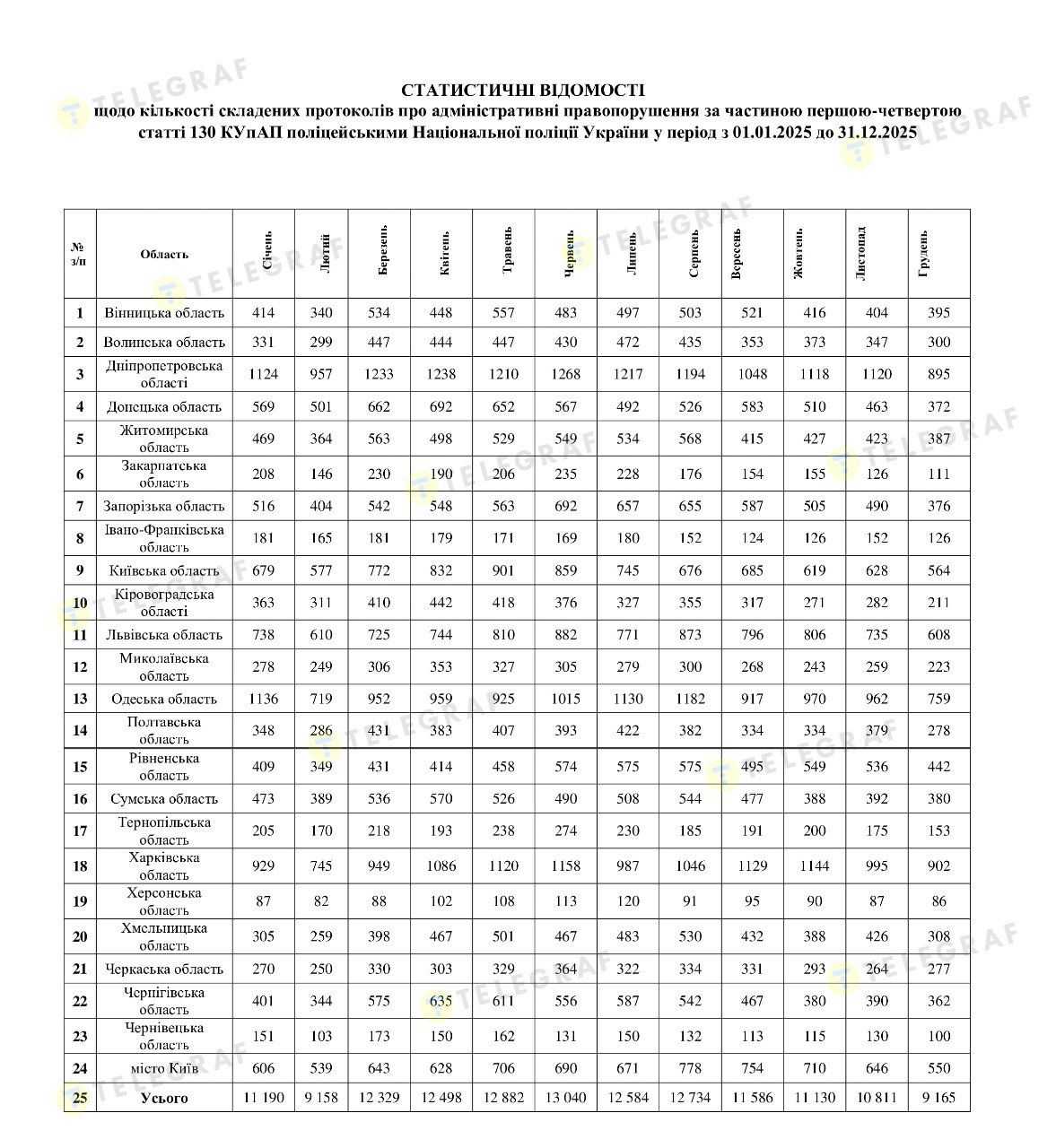 Всего за 2025 год патрульная полиция составила 139 191 протокол за управление транспортом под хмельком. В среднем ежемесячно ловили около 11 600 водителей, которые не смогли устоять перед соблазном выпить перед дорогой.