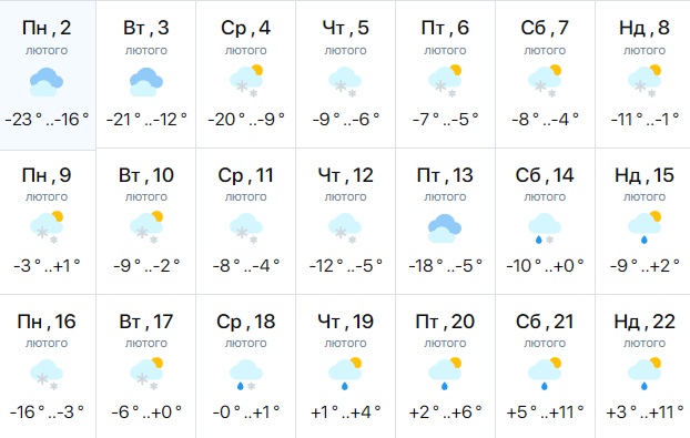 Так, в первой декаде февраля в большей части областей, кроме южных, снова ожидаются морозы до -20 °C. С 8–10 февраля морозы начнут постепенно слабеть, хотя на северо-западе холодная погода, вероятно, продержится почти до конца месяца.