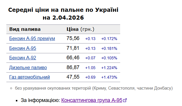 По данным портала Минфин, цены на горючее в Украине продолжают расти на фоне кризиса в Ормузском проливе из-за военного конфликта на Ближнем Востоке. За бензин А-95 премиум просят 75,56 грн, за дизельное топливо 86,87 грн, за автомобильный газ — 47,55 грн.