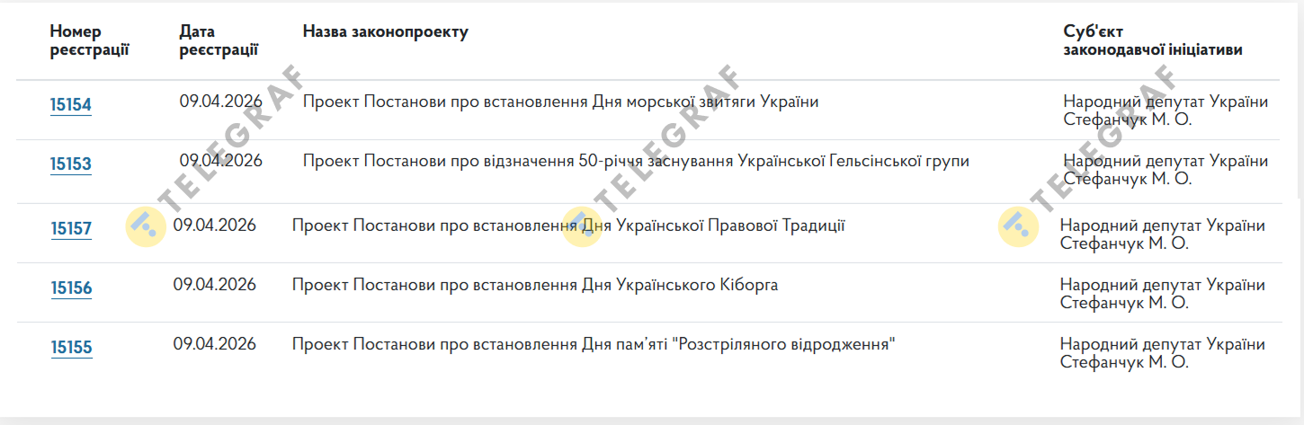 В Верховной Раде зарегистрировали сразу четыре проекта постановлений (№15154–15157), которыми предлагается ввести новые государственные памятные даты. Их автором является народный депутат IX созыва от партии "Слуга народа" Николай Стефанчук.