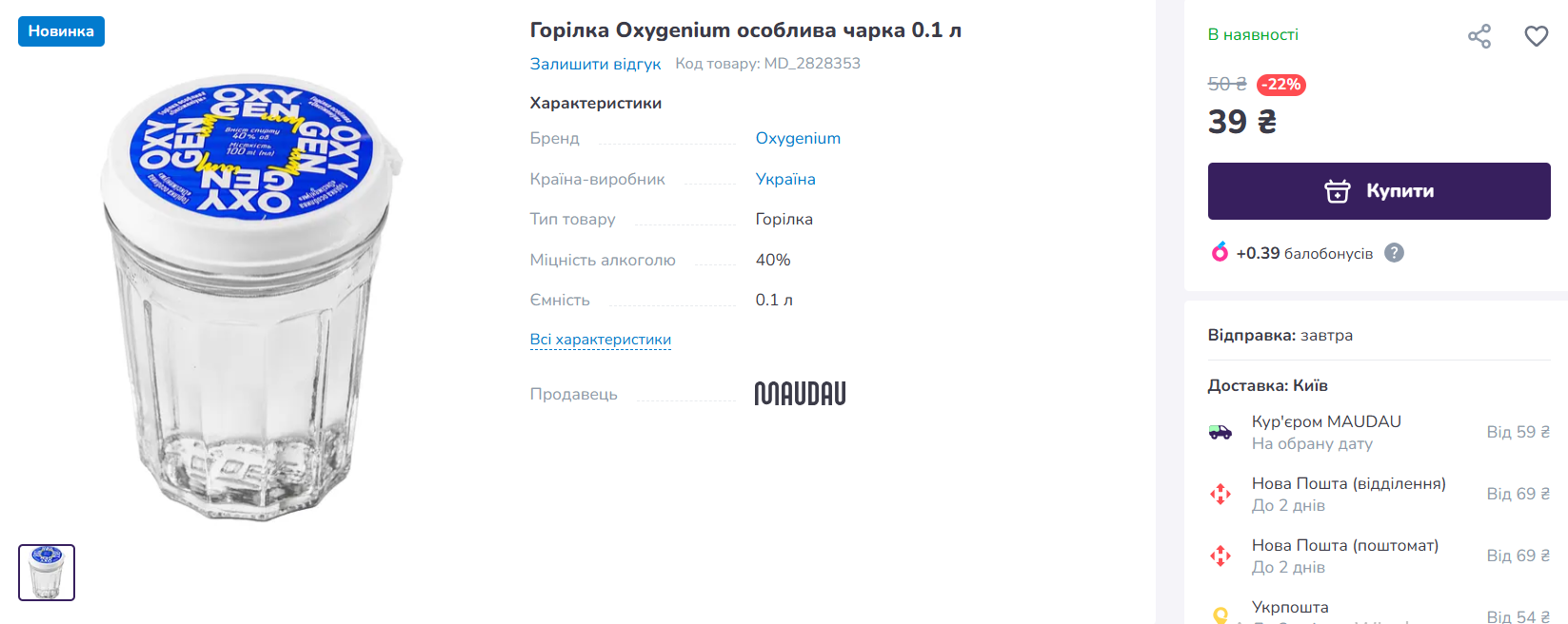 Водка Oxygenium "Особлива чарка" в супермаркетах "АТБ" продается по цене 37,99 грн, в то время как на сайте Maudau указана цена уже со скидкой 39 грн, а предыдущая стоимость новинки 50 грн.