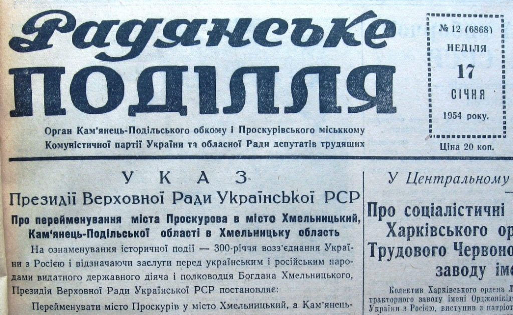 Кардинальные перемены произошли в середине XX века. 16 января 1954 года указом Верховного Совета УССР город Проскуров был переименован в Хмельницкий — в честь Богдана Хмельницкого, хотя сам гетьман с городом связей не имел. Это решение было принято в советский период и было официально привязано к 300-летию так называемого "воссоединения Украины с Россией" — так тогда трактовали Переяславский Совет. Однако была и другая версия, почему именно этот город переименовали — что старое название, вероятно, происходит от слова "проскура" — богослужебного хлеба, который использовался в церковных обрядах. Поговаривали, что кандидаты на переименование были и другие, в частности Тернополь.