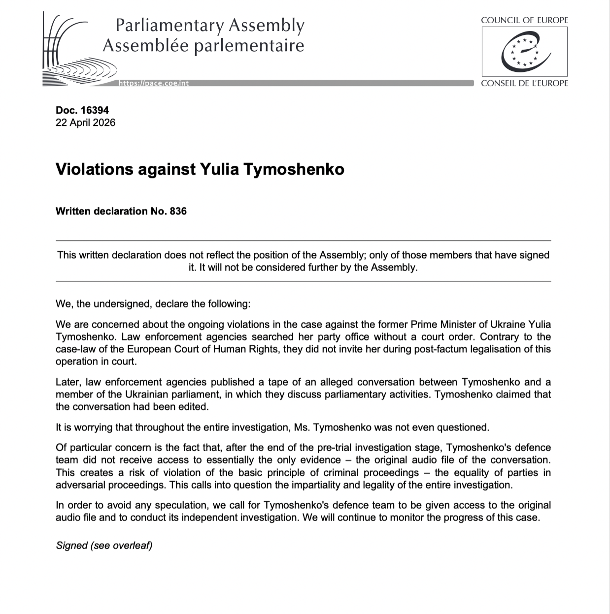 Страны-члены Парламентской ассамблеи Совета Европы в своей письменной декларации выразили обеспокоенность нарушениями по делу НАБУ против Юлии Тимошенко.