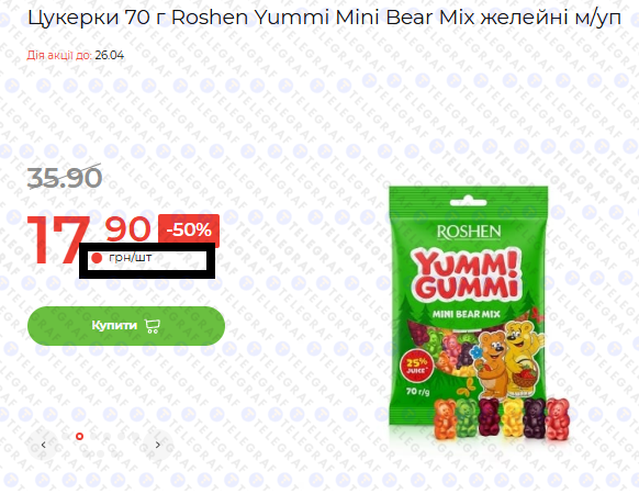 • обозначение "грн/шт" — точная цена за одну единицу товара